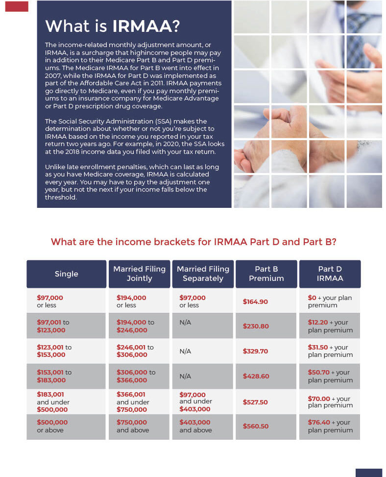 IRMAA stands for Income Related Monthly Adjustment Amount. This gets added to your Part B and Part D Premiums when your income exceeds certain levels, whether filing jointly or as a single. Social Security will look back 2 years to determine the IRMAA if any and if you have had a Life Changing event that lowered your income, there is a form you can file(See online Forms/Documents on your Advisor’s Website) to get your IRMAA lowered or eliminated entirely. To see where you are, refer to the table below.